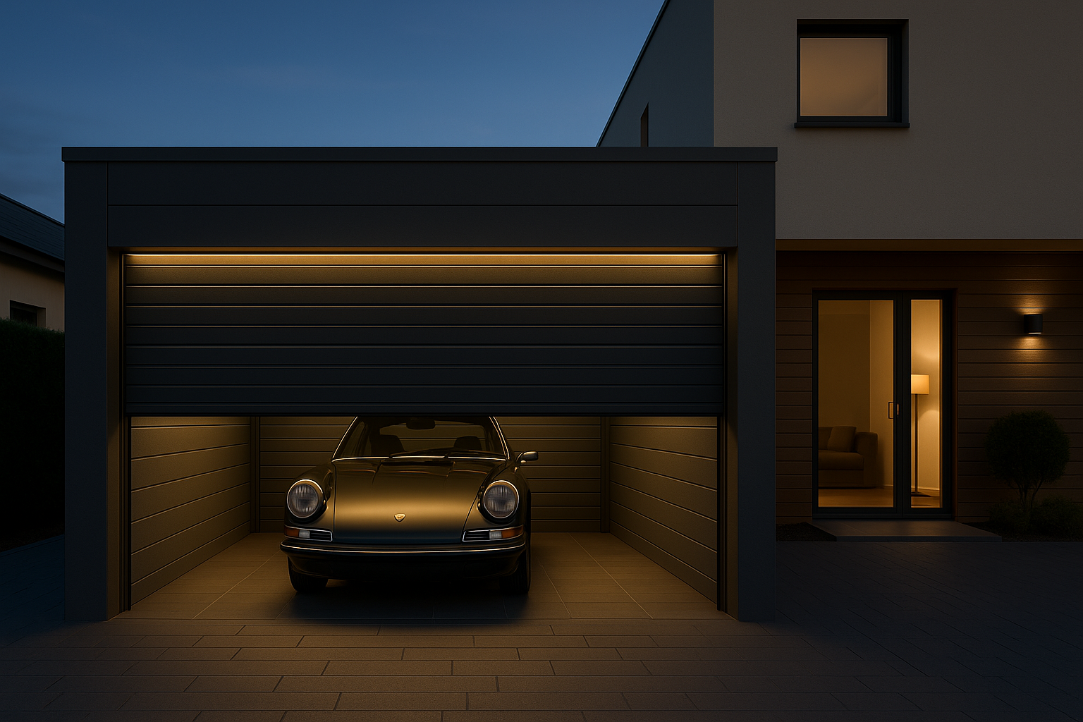 Discreet warm-white LEDs are integrated within the roof louvers, providing soft ambient lighting that enhances both visibility and atmosphere. Designed for everyday practicality and evening impact, the lighting transforms your Pergo-Garage into an architectural feature even